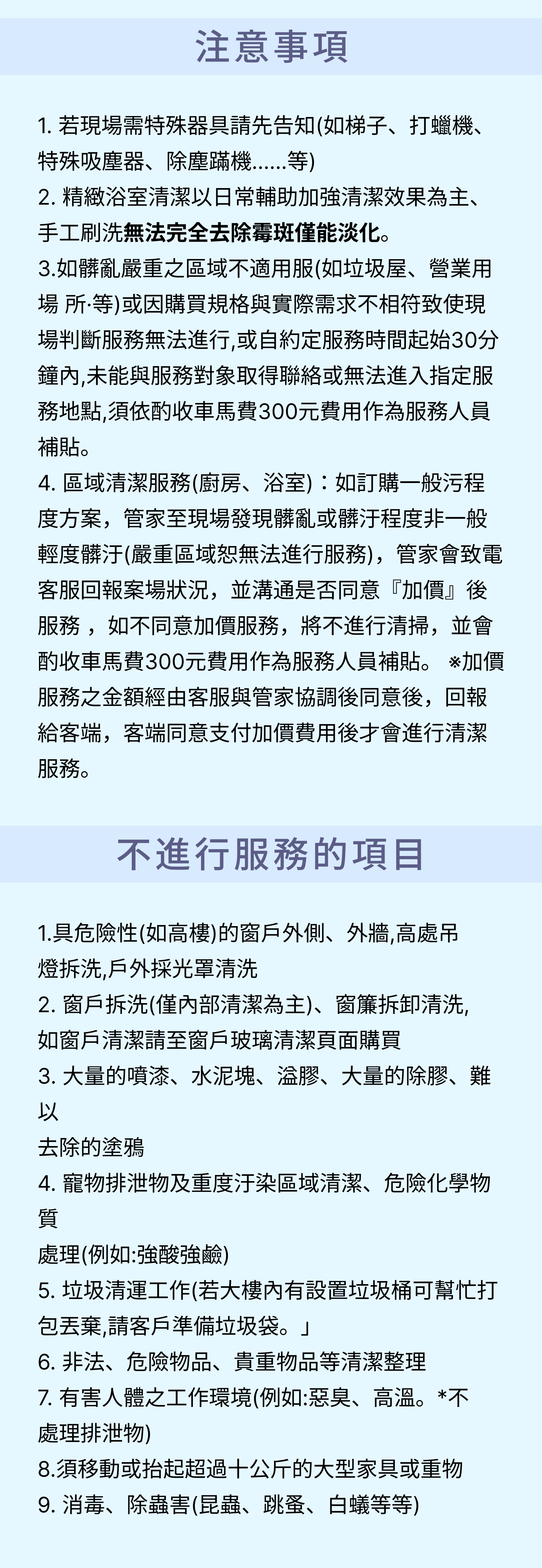 • 窗戶/紗窗不拆洗(僅內部清潔為主)、窗簾拆卸清洗,如窗戶清潔請至窗戶玻璃清潔頁面購買。